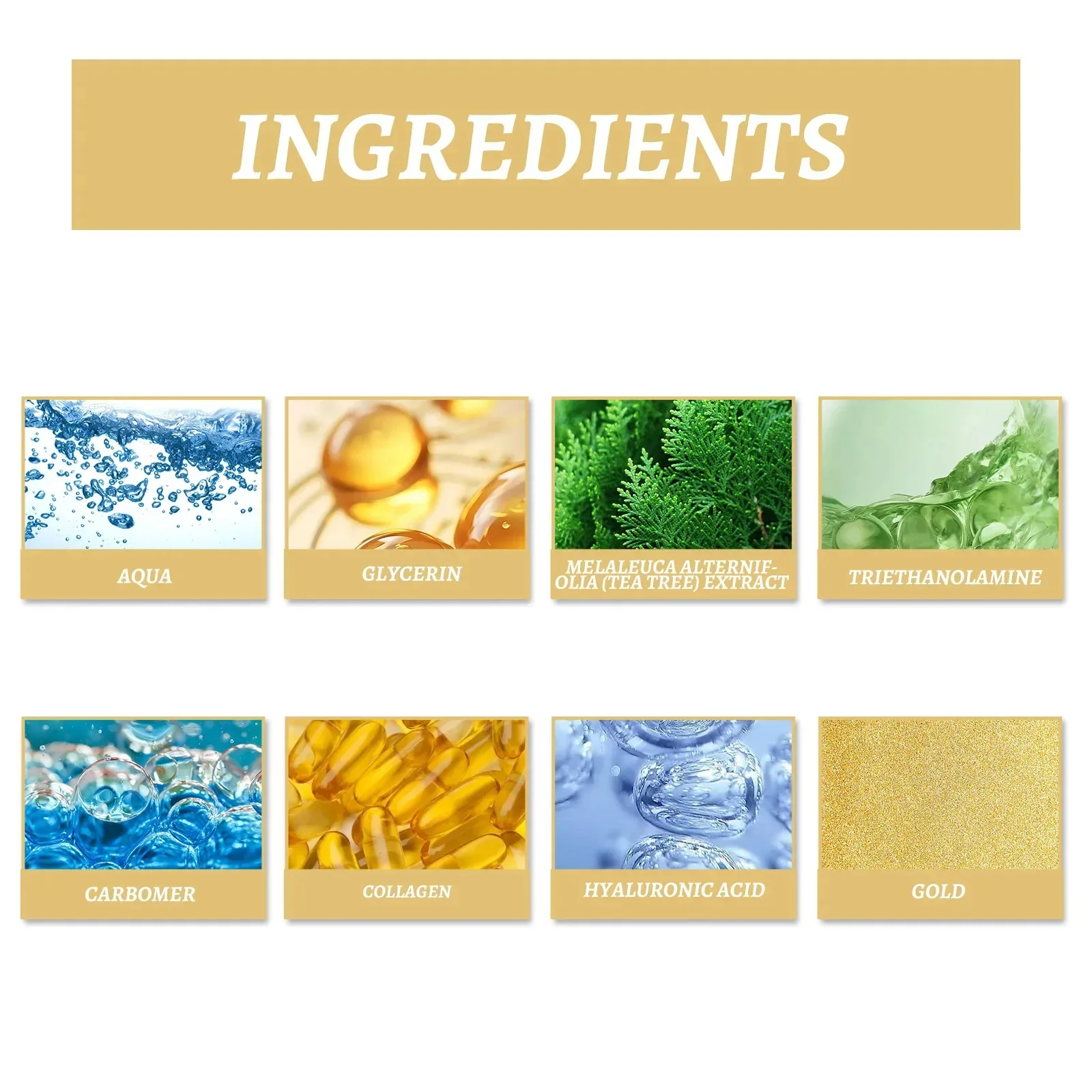 Collagen, Aloe Vera Extract, 24k Gold Leaf, Vitamin C, Niacinamide, Hyaluronic Acid